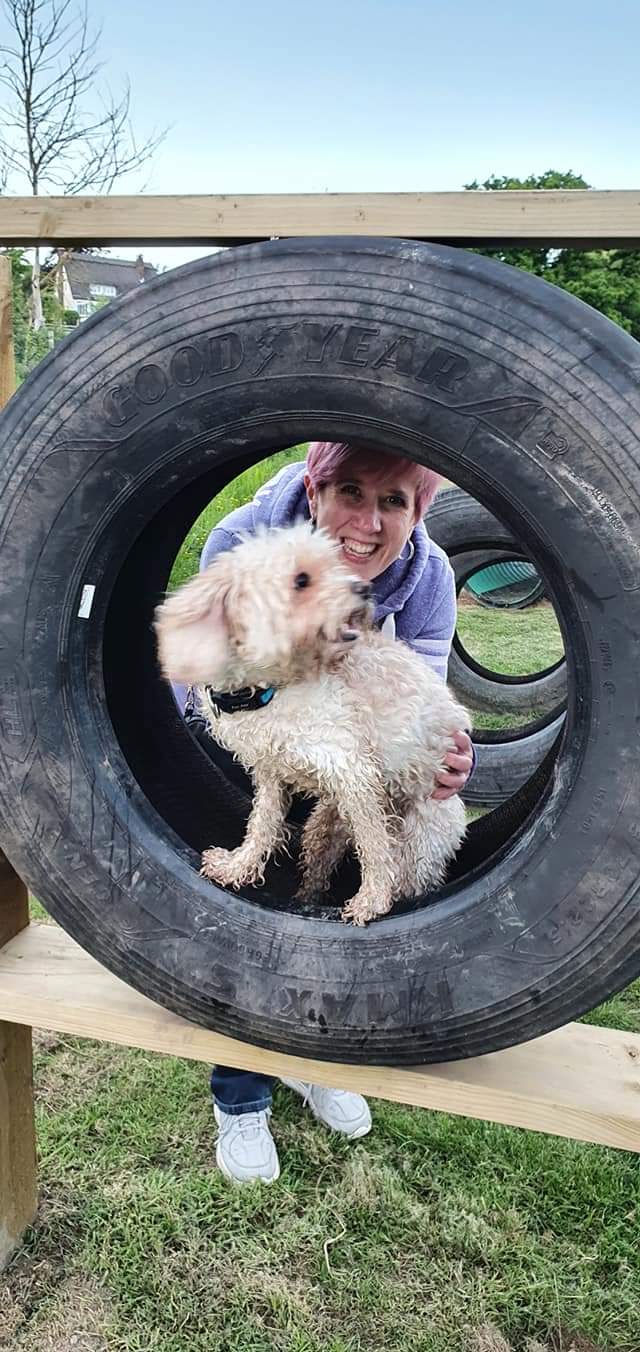 Our top field is kept mown and is ideal for training purposes, recall, games with balls or frisbees and has a small area for agility fun. Hoops, small jumps, Tyres, slalom sticks, a tunnel etc.